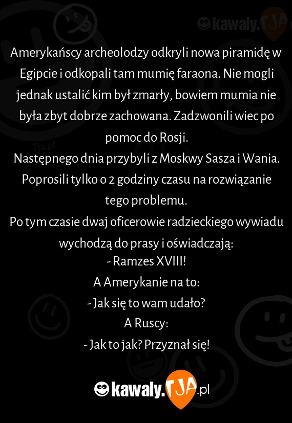 Amerykańscy archeolodzy odkryli nowa piramidę w Egipcie i odkopali tam mumię faraona. Nie mogli jednak ustalić kim był zmarły, bowiem mumia nie była zbyt dobrze zachowana. Zadzwonili wiec po pomoc do Rosji.