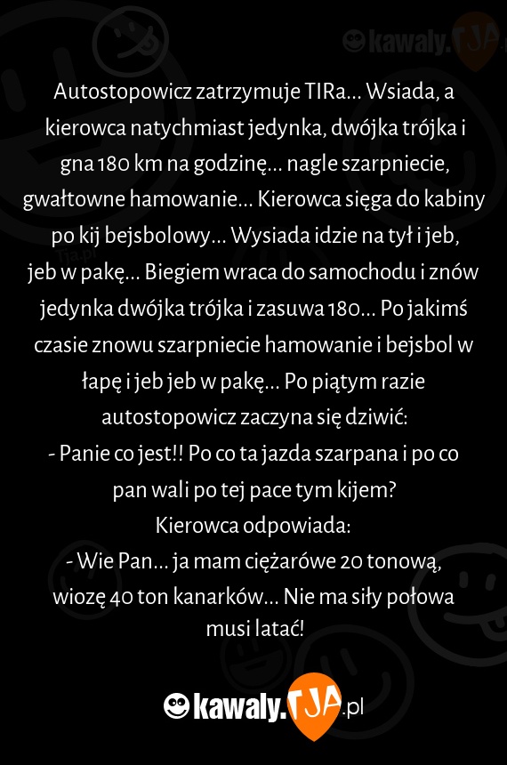 Autostopowicz zatrzymuje TIRa... Wsiada, a kierowca natychmiast jedynka, dwójka trójka i gna 180 km na godzinę... nagle szarpniecie, gwałtowne hamowanie... Kierowca sięga do kabiny po kij bejsbolowy... Wysiada idzie na tył i jeb, jeb w pakę... Biegiem wraca do samochodu i znów jedynka dwójka trójka i zasuwa 180... Po jakimś czasie znowu szarpniecie hamowanie i bejsbol w łapę i jeb jeb w pakę... Po piątym razie autostopowicz zaczyna się dziwić: