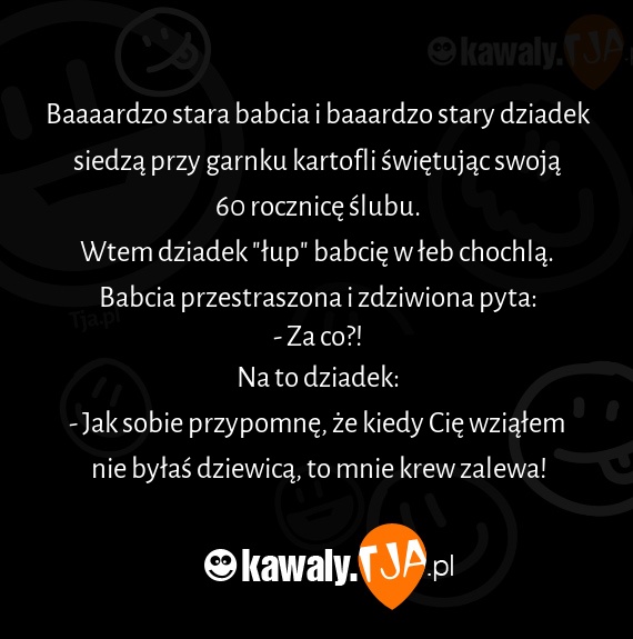 Baaaardzo stara babcia i baaardzo stary dziadek siedzą przy garnku kartofli świętując swoją 60 rocznicę ślubu.