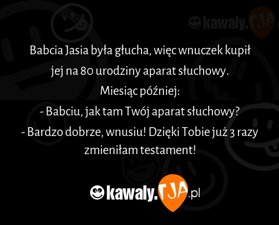 Babcia Jasia była głucha, więc wnuczek kupił jej na 80 urodziny aparat słuchowy. Miesiąc później: - Babciu, jak tam Twój aparat słuchowy? - Bardzo dobrze, wnusiu! Dzięki Tobie już 3 razy zmieniłam testament!