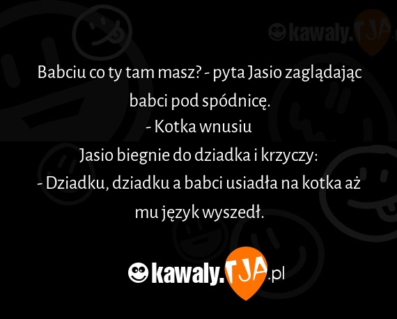 Babciu co ty tam masz? - pyta Jasio zagladajac babci pod spodnice. - Kotka wnusiu Jasio biegnie do dziadka i krzyczy: - Dziadku, dziadku a babci usiadla na kotka az mu jezyk wyszedl.