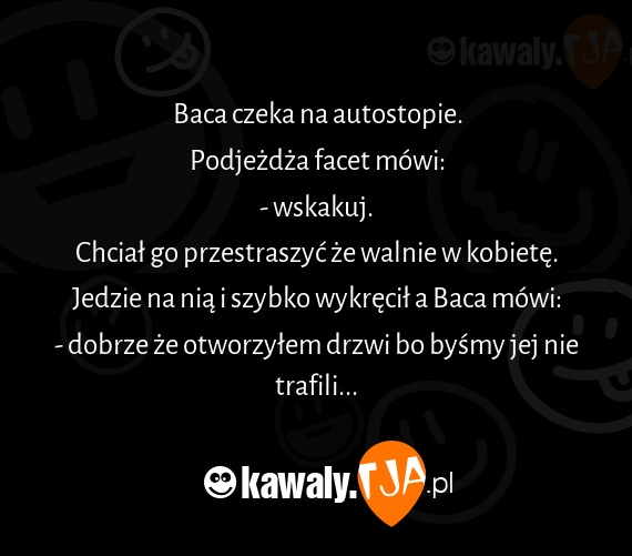 Baca czeka na autostopie. Podjeżdża facet mówi: - wskakuj. Chciał go przestraszyć że walnie w kobietę. Jedzie na nią i szybko wykręcił a Baca mówi: - dobrze że otworzyłem drzwi bo byśmy jej nie trafili...