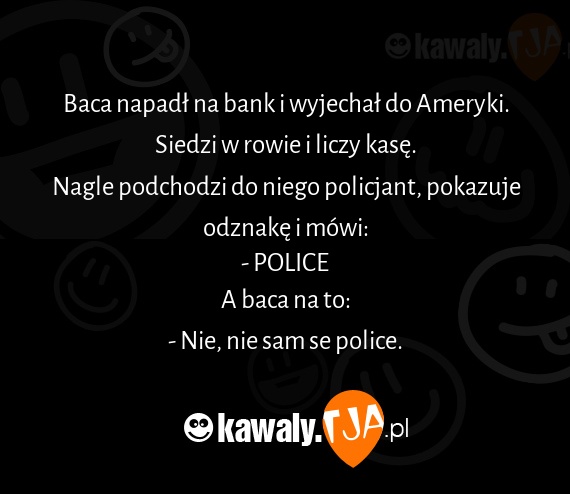 Baca napadł na bank i wyjechał do Ameryki. Siedzi w rowie i liczy kasę. Nagle podchodzi do niego policjant, pokazuje odznakę i mówi: - POLICE A baca na to: - Nie, nie sam se police.