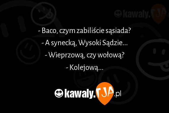 - Baco, czym zabiliscie sasiada? - A synecka, Wysoki Sadzie... - Wieprzowa, czy wolowa? - Kolejowa...