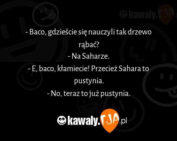 - Baco, gdzieście się nauczyli tak drzewo rąbać? - Na Saharze. - E, baco, kłamiecie! Przecież Sahara to pustynia. - No, teraz to już pustynia.