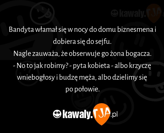 Bandyta włamał się w nocy do domu biznesmena i dobiera się do sejfu. Nagle zauważa, że obserwuje go żona bogacza. - No to jak robimy? - pyta kobieta - albo krzyczę wniebogłosy i budzę męża, albo dzielimy się po połowie.