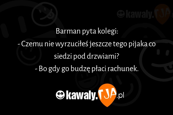 Barman pyta kolegi: - Czemu nie wyrzuciles jeszcze tego pijaka co siedzi pod drzwiami? - Bo gdy go budze placi rachunek.