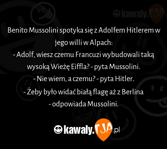 - Adolf, wiesz czemu Francuzi wybudowali taką wysoką Wieżę Eiffla? - pyta Mussolini.