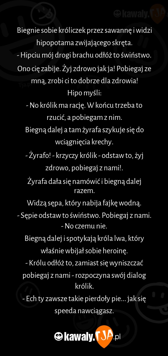 Biegnie sobie króliczek przez sawannę i widzi hipopotama zwijającego skręta.