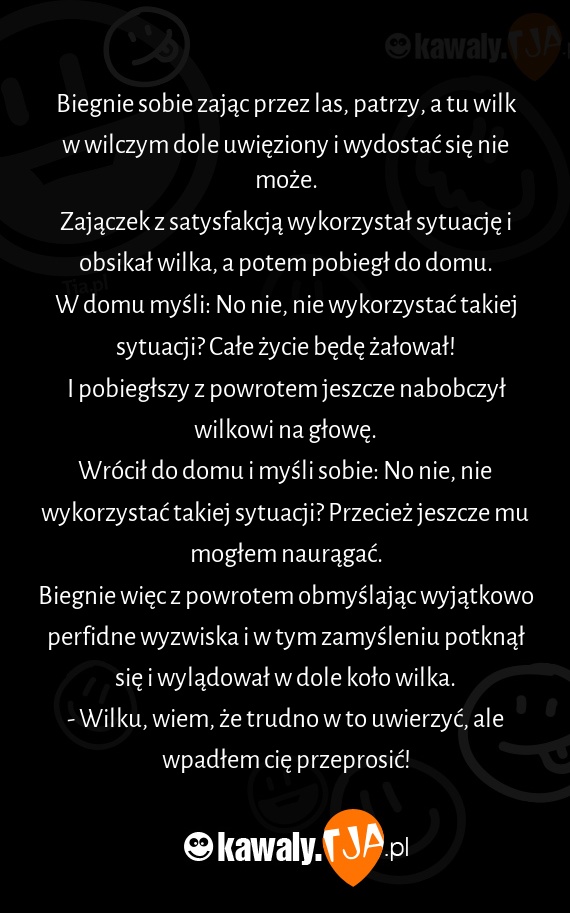 Biegnie sobie zając przez las, patrzy, a tu wilk w wilczym dole uwięziony i wydostać się nie może.