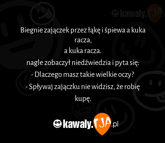 Biegnie zajączek przez łąkę i śpiewa a kuka racza, a kuka racza. nagle zobaczył niedźwiedzia i pyta się: - Dlaczego masz takie wielkie oczy? - Spływaj zajączku nie widzisz, że robię kupę.