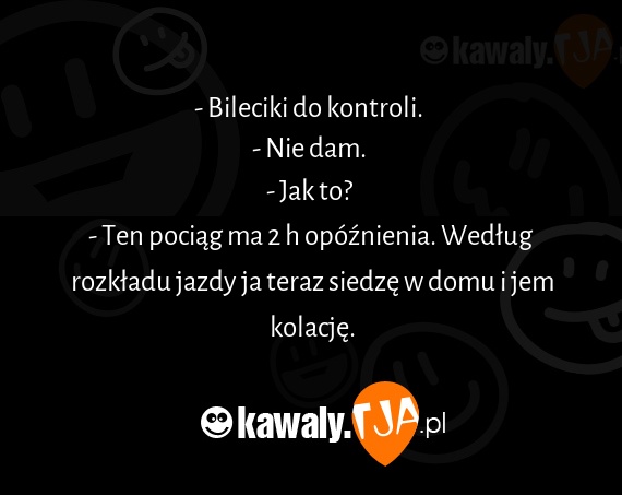 - Bileciki do kontroli. - Nie dam. - Jak to? - Ten pociag ma 2 h opoxnienia. Wedlug rozkladu jazdy ja teraz siedze w domu i jem kolacje.