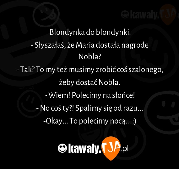 Blondynka do blondynki: - Słyszałaś, że Maria dostała nagrodę Nobla? - Tak? To my też musimy zrobić coś szalonego, żeby dostać Nobla. - Wiem! Polecimy na słońce! - No coś ty?! Spalimy się od razu... -Okay... To polecimy nocą... :)