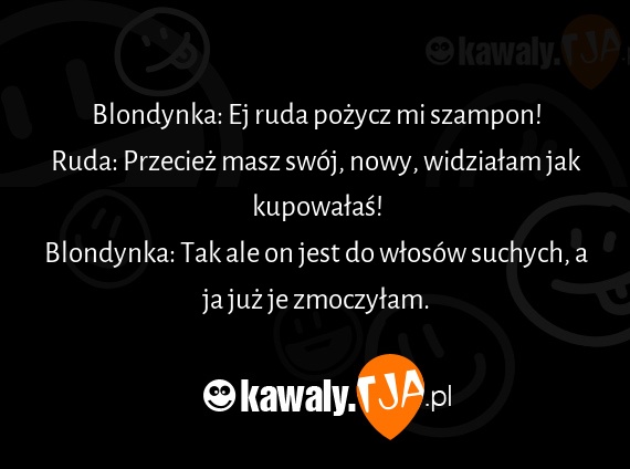 Blondynka: Ej ruda pozycz mi szampon! Ruda: Przeciez masz swoj, nowy, widzialam jak kupowalas! Blondynka: Tak ale on jest do wlosow suchych, a ja juz je zmoczylam.