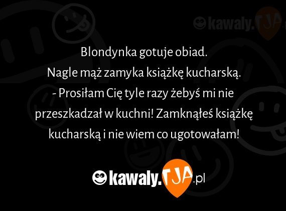 Blondynka gotuje obiad. Nagle maz zamyka ksiazke kucharska. - Prosilam Cie tyle razy zebys mi nie przeszkadzal w kuchni! Zamknales ksiazke kucharska i nie wiem co ugotowalam!