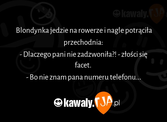 Blondynka jedzie na rowerze i nagle potracila przechodnia: - Dlaczego pani nie zadzwonila?! - zlosci sie facet. - Bo nie znam pana numeru telefonu...