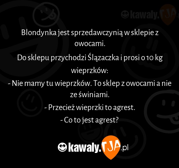 Blondynka jest sprzedawczynia w sklepie z owocami. Do sklepu przychodzi Slazaczka i prosi o 10 kg wieprzkow: - Nie mamy tu wieprzkow. To sklep z owocami a nie ze swiniami. - Przeciez wieprzki to agrest. - Co to jest agrest?