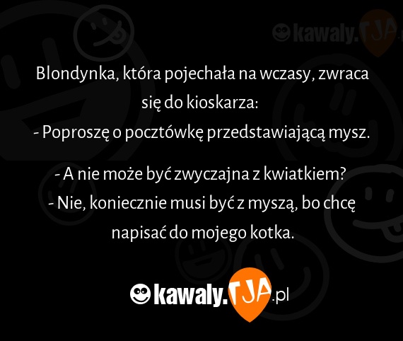 Blondynka, która pojechała na wczasy, zwraca się do kioskarza: - Poproszę o pocztówkę przedstawiającą mysz. - A nie może być zwyczajna z kwiatkiem? - Nie, koniecznie musi być z myszą, bo chcę napisać do mojego kotka.