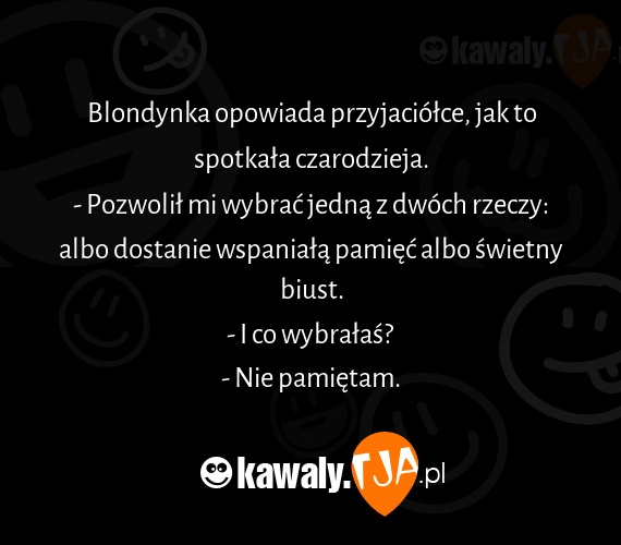 Blondynka opowiada przyjaciółce, jak to spotkała czarodzieja. - Pozwolił mi wybrać jedną z dwóch rzeczy: albo dostanie wspaniałą pamięć albo świetny biust. - I co wybrałaś? - Nie pamiętam.
