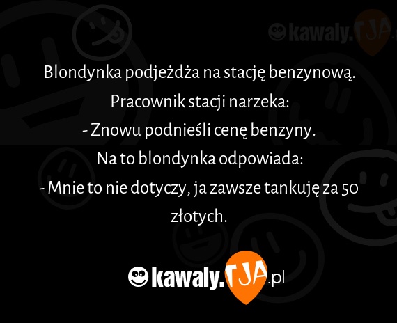 Blondynka podjeżdża na stację benzynową. Pracownik stacji narzeka: - Znowu podnieśli cenę benzyny. Na to blondynka odpowiada: - Mnie to nie dotyczy, ja zawsze tankuję za 50 złotych.
