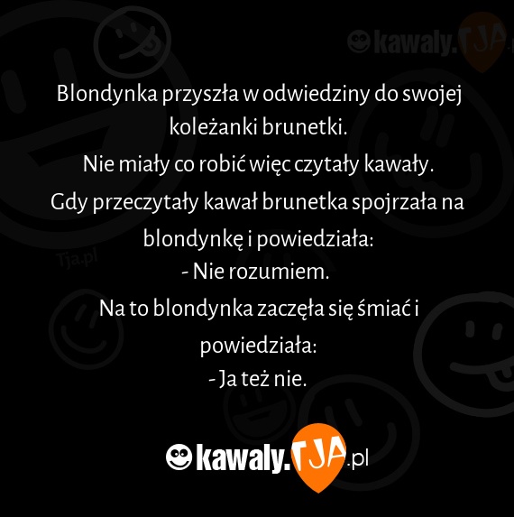 Blondynka przyszła w odwiedziny do swojej koleżanki brunetki. Nie miały co robić więc czytały kawały. Gdy przeczytały kawał brunetka spojrzała na blondynkę i powiedziała: - Nie rozumiem. Na to blondynka zaczęła się śmiać i powiedziała: - Ja też nie.