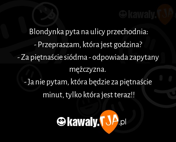 Blondynka pyta na ulicy przechodnia: - Przepraszam, która jest godzina? - Za piętnaście siódma - odpowiada zapytany mężczyzna. - Ja nie pytam, która będzie za piętnaście minut, tylko która jest teraz!!