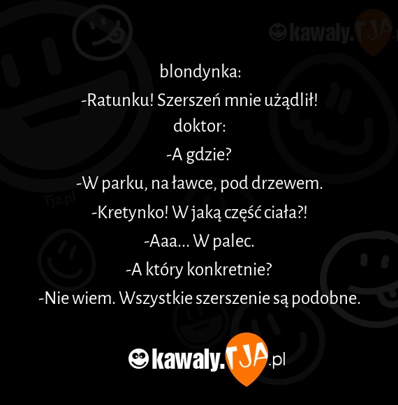 blondynka: -Ratunku! Szerszen mnie uzadlil! doktor: -A gdzie? -W parku, na lawce, pod drzewem. -Kretynko! W jaka czesc ciala?! -Aaa... W palec. -A ktory konkretnie? -Nie wiem. Wszystkie szerszenie sa podobne.