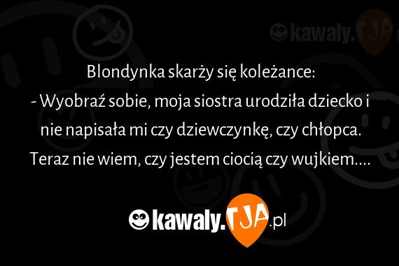 Blondynka skarzy sie kolezance: - Wyobrax sobie, moja siostra urodzila dziecko i nie napisala mi czy dziewczynke, czy chlopca. Teraz nie wiem, czy jestem ciocia czy wujkiem....