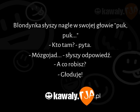 Blondynka słyszy nagle w swojej głowie "puk, puk..." - Kto tam? - pyta. - Mózgojad... - słyszy odpowiedź. - A co robisz? - Głoduję!