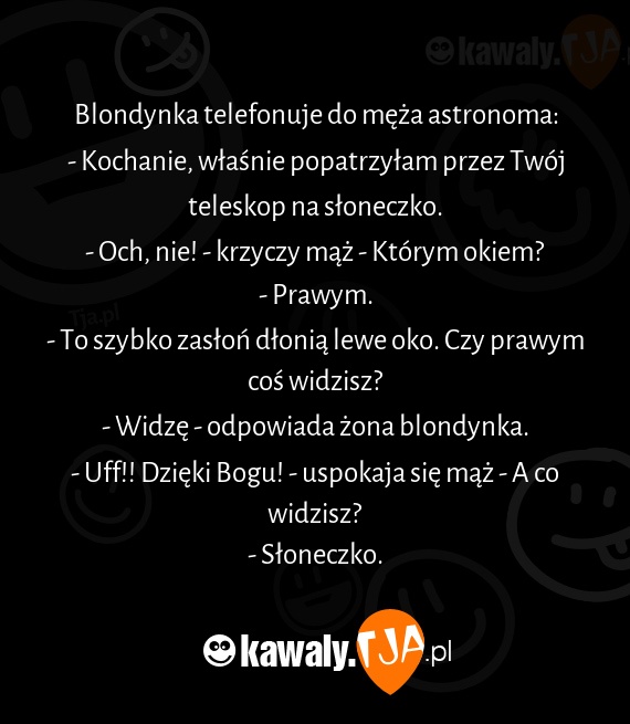 Blondynka telefonuje do męża astronoma: - Kochanie, właśnie popatrzyłam przez Twój teleskop na słoneczko. - Och, nie! - krzyczy mąż - Którym okiem? - Prawym. - To szybko zasłoń dłonią lewe oko. Czy prawym coś widzisz? - Widzę - odpowiada żona blondynka. - Uff!! Dzięki Bogu! - uspokaja się mąż - A co widzisz? - Słoneczko.