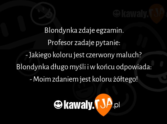 Blondynka zdaje egzamin. Profesor zadaje pytanie: - Jakiego koloru jest czerwony maluch? Blondynka dlugo mysli i w koncu odpowiada: - Moim zdaniem jest koloru zoltego!