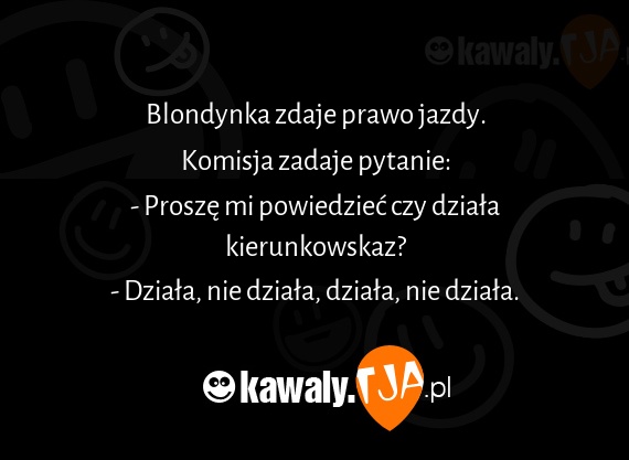 Blondynka zdaje prawo jazdy. Komisja zadaje pytanie: - Proszę mi powiedzieć czy działa kierunkowskaz? - Działa, nie działa, działa, nie działa.
