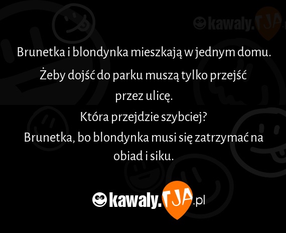 Brunetka i blondynka mieszkają w jednym domu. Żeby dojść do parku muszą tylko przejść przez ulicę. Która przejdzie szybciej? Brunetka, bo blondynka musi się zatrzymać na obiad i siku.