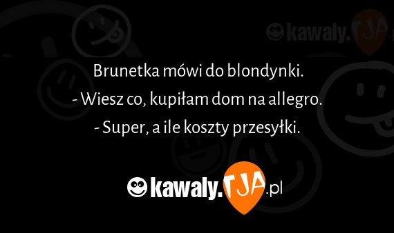 Brunetka mowi do blondynki. - Wiesz co, kupilam dom na allegro. - Super, a ile koszty przesylki.