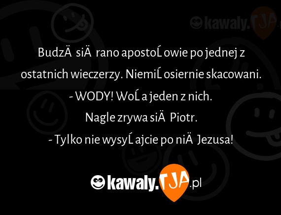 Budzą się rano apostołowie po jednej z ostatnich wieczerzy. Niemiłosiernie skacowani. - WODY! Woła jeden z nich. Nagle zrywa się Piotr. - Tylko nie wysyłajcie po nią Jezusa!