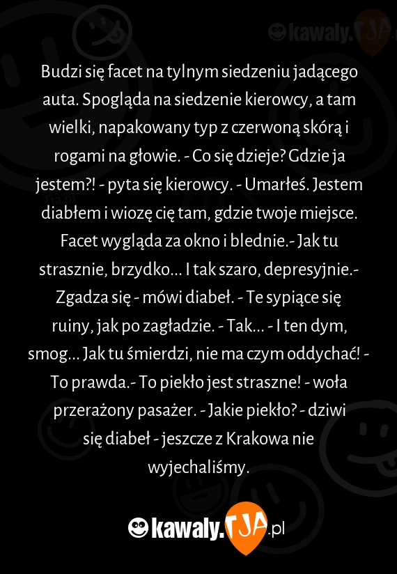 Budzi się facet na tylnym siedzeniu jadącego auta. Spogląda na siedzenie kierowcy, a tam wielki, napakowany typ z czerwoną skórą i rogami na głowie. - Co się dzieje? Gdzie ja jestem?! - pyta się kierowcy. - Umarłeś. Jestem diabłem i wiozę cię tam, gdzie twoje miejsce. Facet wygląda za okno i blednie.- Jak tu strasznie, brzydko... I tak szaro, depresyjnie.- Zgadza się - mówi diabeł. - Te sypiące się ruiny, jak po zagładzie. - Tak... - I ten dym, smog... Jak tu śmierdzi, nie ma czym oddychać! - To prawda.- To piekło jest straszne! - woła przerażony pasażer. - Jakie piekło? - dziwi się diabeł - jeszcze z Krakowa nie wyjechaliśmy.