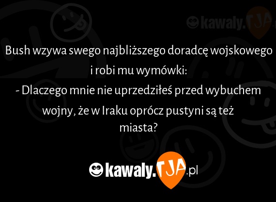 Bush wzywa swego najblizszego doradce wojskowego i robi mu wymowki: - Dlaczego mnie nie uprzedziles przed wybuchem wojny, ze w Iraku oprocz pustyni sa tez miasta?