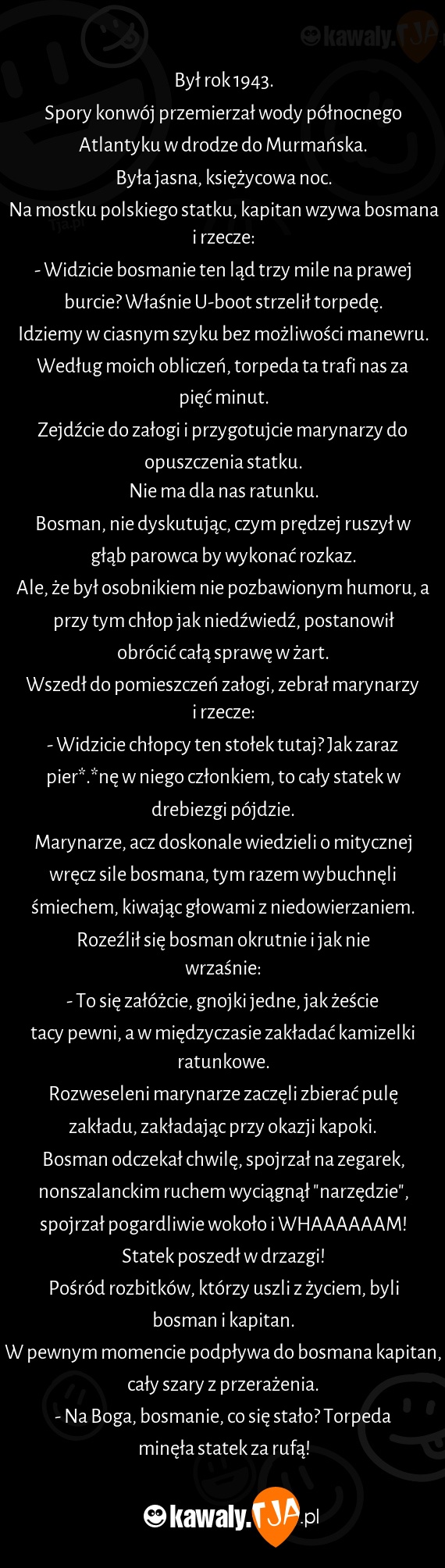 - Na Boga, bosmanie, co się stało? Torpeda minęła statek za rufą!