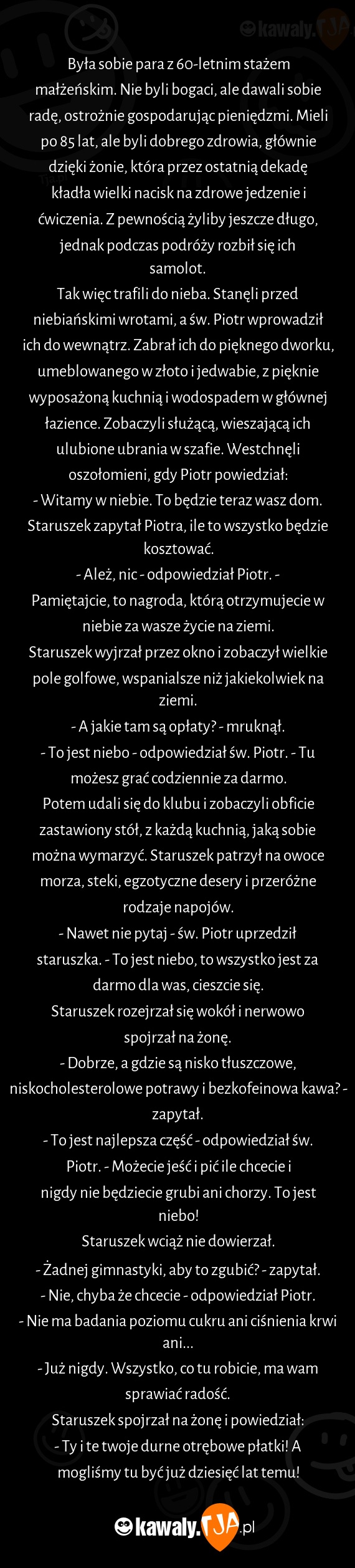 - To jest najlepsza część - odpowiedział św. Piotr. - Możecie jeść i pić ile chcecie i nigdy nie będziecie grubi ani chorzy. To jest niebo!