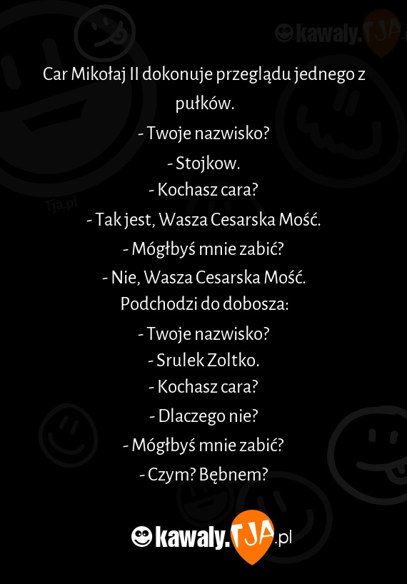 Car Mikolaj II dokonuje przegladu jednego z pulkow. - Twoje nazwisko? - Stojkow. - Kochasz cara? - Tak jest, Wasza Cesarska Mosc. - Moglbys mnie zabic? - Nie, Wasza Cesarska Mosc. Podchodzi do dobosza: - Twoje nazwisko? - Srulek Zoltko. - Kochasz cara? - Dlaczego nie? - Moglbys mnie zabic? - Czym? Bebnem?