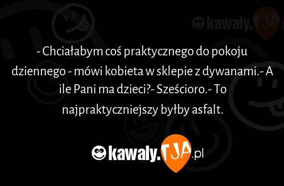 - Chciałabym coś praktycznego do pokoju dziennego - mówi kobieta w sklepie z dywanami.- A ile Pani ma dzieci?- Sześcioro.- To najpraktyczniejszy byłby asfalt.