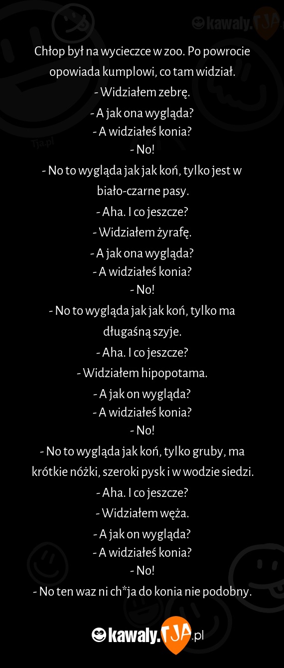 Chłop był na wycieczce w zoo. Po powrocie opowiada kumplowi, co tam widział.