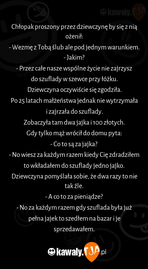 - No wiesz za każdym razem kiedy Cię zdradziłem to wkładałem do szuflady jedno jajko.