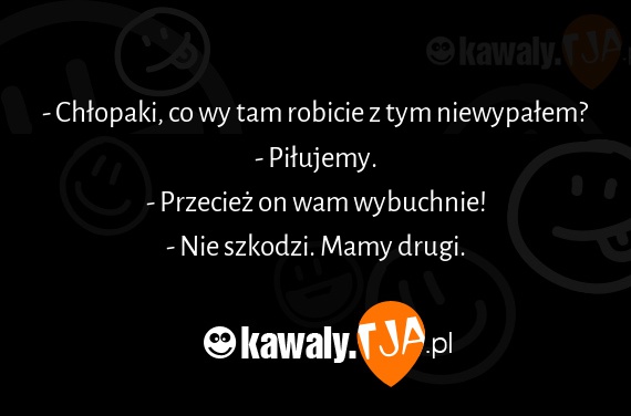 - Chłopaki, co wy tam robicie z tym niewypałem? - Piłujemy. - Przecież on wam wybuchnie! - Nie szkodzi. Mamy drugi.
