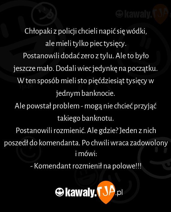 Postanowili rozmienić. Ale gdzie? Jeden z nich poszedł do komendanta. Po chwili wraca zadowolony i mówi: