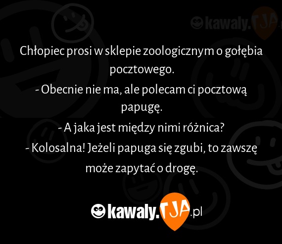 Chłopiec prosi w sklepie zoologicznym o gołębia pocztowego. - Obecnie nie ma, ale polecam ci pocztową papugę. - A jaka jest między nimi różnica? - Kolosalna! Jeżeli papuga się zgubi, to zawszę może zapytać o drogę.
