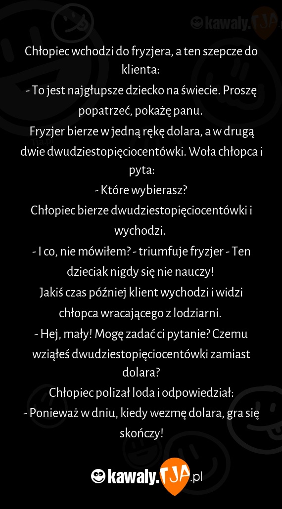 Fryzjer bierze w jedną rękę dolara, a w drugą dwie dwudziestopięciocentówki. Woła chłopca i pyta: