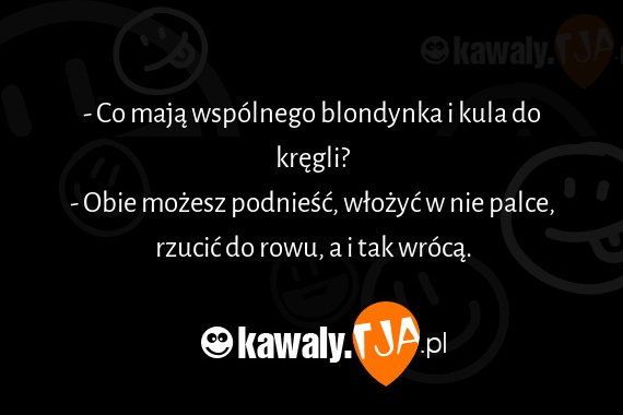 - Co maja wspolnego blondynka i kula do kregli? - Obie mozesz podniesc, wlozyc w nie palce, rzucic do rowu, a i tak wroca.