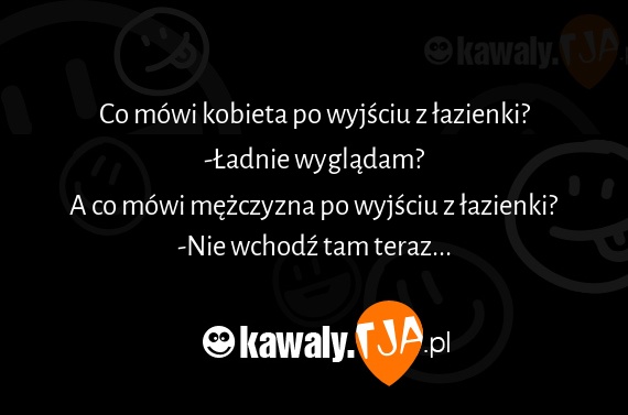 Co mówi kobieta po wyjściu z łazienki? -Ładnie wyglądam? A co mówi mężczyzna po wyjściu z łazienki? -Nie wchodź tam teraz...