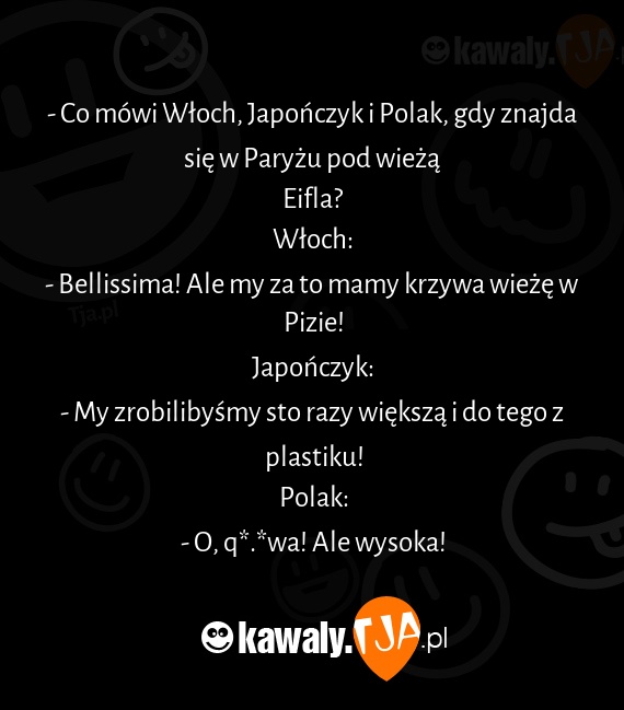 - Co mówi Włoch, Japończyk i Polak, gdy znajda się w Paryżu pod wieżą Eifla? Włoch: - Bellissima! Ale my za to mamy krzywa wieżę w Pizie! Japończyk: - My zrobilibyśmy sto razy większą i do tego z plastiku! Polak: - O, q*.*wa! Ale wysoka!